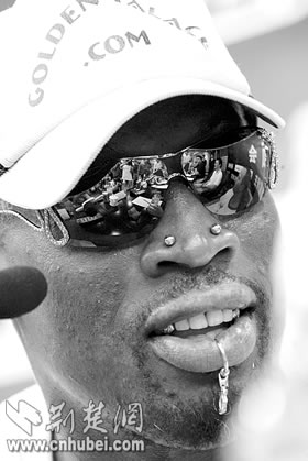 荊楚網消息(楚天都市報)(記者門天清 實習生周玥廷 金天)昨日中午,有著8年NBA職業(yè)球員生涯,并擁有6枚NBA總冠軍戒指的前NBA巨星羅德曼一行從上海飛抵武漢,他將參加于今晚在漢舉行的“2005美國前NBA巨星王朝中國巡演”第一站的比賽。