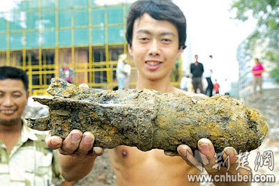民工王先生說,他們挖坑時(shí),鐵鍬突然碰到一個(gè)硬東西,扒出一看,竟然是個(gè)“啞”炮。隨后,他們又在旁邊挖出一些人的尸骨。