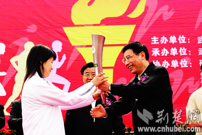 昨日8時30分許,硚口體育廣場彩旗飄揚、鑼鼓喧天。省委常委、武漢市委書記苗圩點燃武漢市第七屆運動會火種,交由奧運冠軍喬紅引燃各區(qū)火炬,領跑該市近5000人的火炬大傳遞。