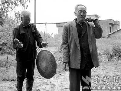 圖為村中兩位老人演示“九錘迎親鑼”。