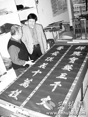 荊楚網(wǎng)消息(楚天都市報(bào))(記者何君輝)昨日,收藏者王先生在漢繡傳人任本榮家中,展示了自己珍藏的一幅刺繡對(duì)聯(lián)。對(duì)聯(lián)長(zhǎng)2.4米,以花朵圖案拼接出“輝騰寶婺三千丈香發(fā)琪花十萬(wàn)枝”字樣。王先生說(shuō),自己十多年前在地?cái)偵匣?00元購(gòu)得這件繡品,一直沒(méi)有機(jī)會(huì)為它“驗(yàn)明正身”
