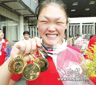 “這三枚金牌,一枚要送給爸爸,一枚送給媽媽?zhuān)有一枚要留給自己,我把鮮花送給教練!”昨日中午,剛剛走出漢口火車(chē)站的胡鳳琴,向前來(lái)迎接的市民及新聞媒體道出了自己的心聲。