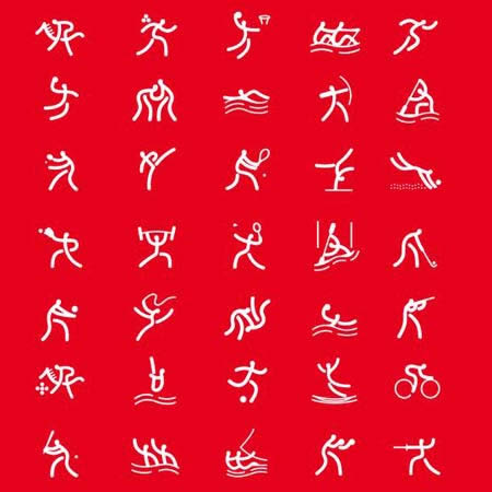 北京奧運(yùn)會體育圖標(biāo)設(shè)計包括35個圖標(biāo),分別是田徑、賽艇、羽毛球、棒球、籃球、拳擊、皮筏艇(靜水)、皮筏艇(激流)、自行車、馬術(shù)、擊劍、足球、體操、藝術(shù)體操、蹦床、舉重、手球、曲棍球、柔道、摔跤、游泳、花樣游泳、跳水、水球、現(xiàn)代五項(xiàng)、壘球、跆拳道、網(wǎng)球、乒乓球、射擊、射箭、鐵人三項(xiàng)、帆船、排球和沙灘排球。