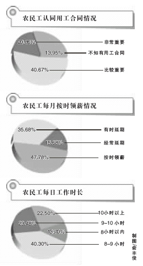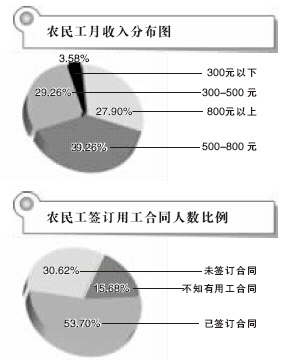 調(diào)查顯示農(nóng)民工月薪多在500到800元之間,22.5%的農(nóng)民工每日工作超10小時