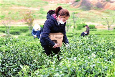據(jù)了解,該基地由在外創(chuàng)業(yè)回鄉(xiāng)人員于2015年興建,占地500余畝,目前已逐步成園?;刈?月6日復工以來,日平吸納當?shù)貏趧恿?0余人次采茶。
