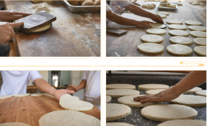麻餅在制作前,先要炒好芝麻,炒好的芝麻倒進竹匾,其香味隔著鏡頭似乎都能聞得到。用各色干果仁、加上冰糖、陳皮、金錢桔等,十幾種食料破碎攪拌而成的餡料被搓好了,面團也被分成適量的面劑,再將搓好的餡料包進去,在鐵箍模具中,用木柄敲打延展和切削定型。