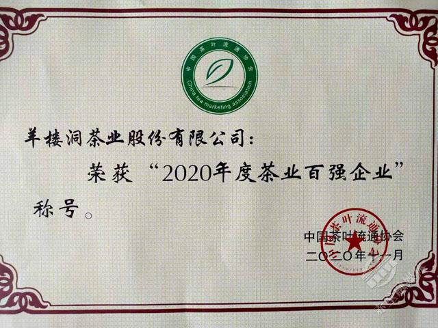 11月18日,第十六屆中國(guó)茶業(yè)經(jīng)濟(jì)年會(huì)正式發(fā)布了2020中國(guó)茶葉行業(yè)調(diào)查的最終結(jié)果,對(duì)年度中國(guó)茶業(yè)優(yōu)秀企業(yè)、優(yōu)秀縣域進(jìn)行授牌表彰。赤壁市榮獲“十三五百?gòu)?qiáng)縣市十強(qiáng)”和“2020年度茶業(yè)百?gòu)?qiáng)縣”稱號(hào),其中“十三五百?gòu)?qiáng)縣市十強(qiáng)”中赤壁市是湖北省唯一入選的縣市,在“2020年度茶業(yè)百?gòu)?qiáng)企業(yè)”評(píng)選中,羊樓洞茶業(yè)股份有限公司成為咸寧市唯一入選的企業(yè)。