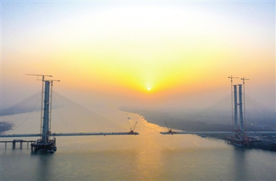 該橋南岸灘橋最后一孔50米的現(xiàn)澆箱梁已施工完畢。主跨橋梁也在不斷的實現(xiàn)合龍,目前合龍距離還剩76米。預計今年三月底實現(xiàn)合龍。