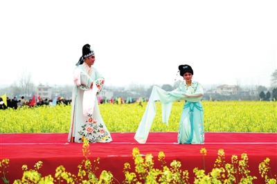 精彩的文藝演出、極具地方風(fēng)情的民俗表演和國(guó)家非物質(zhì)文化遺產(chǎn)提琴戲演唱,與花海交相輝映,為大家?guī)砹艘暵犑⒀?。開幕后,游客開始游玩賞景,大家邊感嘆七彩油菜花的美,邊呼朋引伴拍照留念,人花相映襯,美不勝收。除了賞花,大家還紛紛品嘗特色美食,購(gòu)買當(dāng)?shù)靥厣r(nóng)產(chǎn)品。