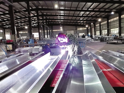 在中港金屬制造有限公司車(chē)間外,一輛加長(zhǎng)貨車(chē)正在裝運(yùn)送往武漢的成品。車(chē)間里,焊花飛濺,工人們正在熟練地完成原材料開(kāi)料、折彎、焊接、拋光等工序。