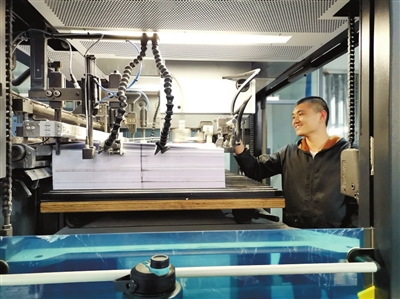 3月3日,記者在山河文化發(fā)展有限公司看到,車(chē)間里機(jī)聲隆隆。在一個(gè)大型流水機(jī)器旁,一名員工專(zhuān)注地放紙,隨后機(jī)械打印、切割、檢驗(yàn)、裝訂成書(shū)……人機(jī)配合十分默契。