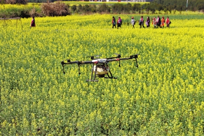 3月4日,在咸安區(qū)馬橋鎮(zhèn)建國(guó)畈油菜花海,一臺(tái)無(wú)人機(jī)盤旋在油菜花田上方,為油菜噴施環(huán)保復(fù)合肥。據(jù)咸安區(qū)農(nóng)業(yè)農(nóng)村局介紹,這是通過(guò)無(wú)人機(jī)來(lái)給油菜送“套餐”,無(wú)人機(jī)攜帶著精心調(diào)配的藥肥,能夠快速的對(duì)油菜大面積噴灑覆蓋,作業(yè)效率和效果顯著優(yōu)于人工噴施。