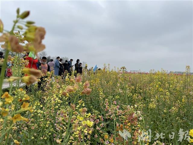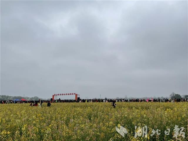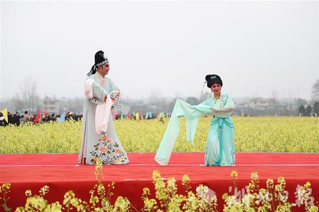 油菜花有普通的黃色、橙黃、桃紅、紫紅等顏色,游客擠在田埂上拍照。青山鎮(zhèn)在菜地里搭起了舞臺(tái),舉辦首屆七彩油菜花節(jié)開幕式,提琴戲、腰鼓等好戲連臺(tái),《我家在崇陽(yáng)》歌聲在花海中回蕩。