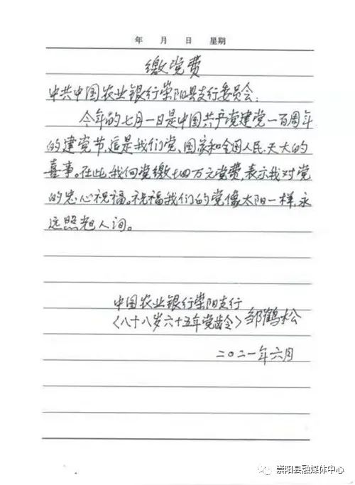 廖海峰告訴記者,來之前,鄒鶴松老人特意向中國農(nóng)業(yè)銀行崇陽支行黨委寫了一封信,信里這樣寫著:“今年是中國共產(chǎn)黨建黨100周年,這是我們黨、國家和全國人民天大的喜事。在此,我向黨繳納4萬元黨費(fèi),表示我對黨的衷心祝福。祝福我們的黨像太陽一樣,永遠(yuǎn)照耀人間?!币痪渚浜唵螛銓?shí)的語言,彰顯著一名老黨員赤心向黨、一心為黨樸實(shí)而偉大的情懷。