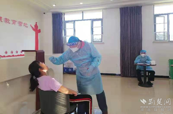 為盡快完成紅安轄區(qū)全民核酸檢測(cè)工作,在接到入戶檢測(cè)通知后,該市疾控中心采樣組工作人員不畏酷暑,在集中隔離點(diǎn)為隔離人員做核酸檢測(cè)。