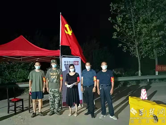 在勝利鎮(zhèn)松子關(guān)省際卡口,由鎮(zhèn)村組成的志愿者隊伍克服酷熱,晝夜嚴格排查過往司乘車輛,摸排中高風(fēng)險地區(qū)來羅返羅人員,在他們身后,鮮艷的黨旗迎風(fēng)飄揚。