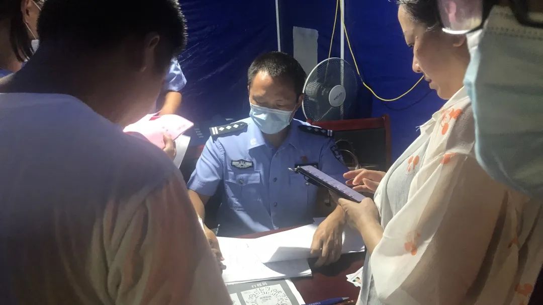 8月6日中午,氣溫近40攝氏度,熱風(fēng)滾燙。馬橋派出所民警雷剛早已汗流浹背,這是他和戰(zhàn)友當(dāng)天執(zhí)勤的第5個(gè)小時(shí)。截停車(chē)輛,測(cè)量體溫,登記錄入……雷剛不停重復(fù)著,被口罩和護(hù)目鏡遮得嚴(yán)實(shí)的臉龐,在太陽(yáng)的燒灼中透著深褐,與頭頂?shù)陌咨弊有纬煞置鞯姆床睢?/p>
