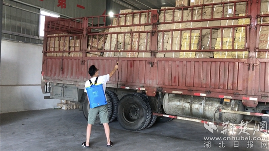 倉(cāng)庫(kù)員工進(jìn)行全面消毒。通訊員供圖