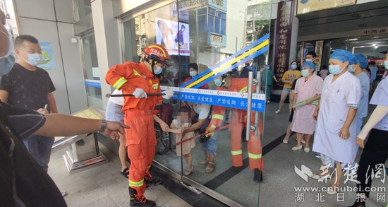 四歲女孩左手臂被醫(yī)院玻璃門卡住,消防開展救援。通訊員供圖