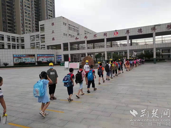 荊楚網(wǎng)(湖北日報(bào)網(wǎng))訊 (通訊員毛紅平)9月1日早上8點(diǎn)左右,在紅安縣永佳河鎮(zhèn)小學(xué)大門口,孩子們佩戴口罩,陸續(xù)來到學(xué)校,大家按照間隔一米的距離要求排隊(duì),經(jīng)過體溫測量后有序進(jìn)入校園。