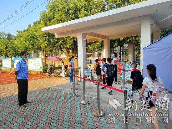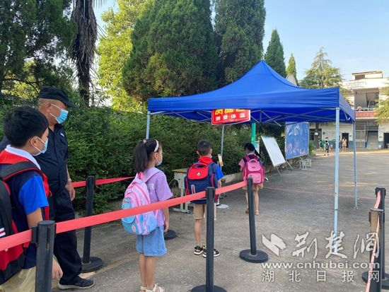 黃石開發(fā)區(qū)?鐵山區(qū)鐘山小學(xué)學(xué)生依次排隊,有序測溫。朱敏 供圖