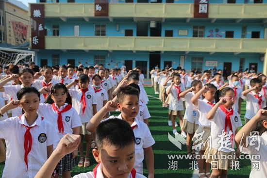 為紀(jì)念抗戰(zhàn)勝利76周年,鐵山三小開學(xué)典禮上,隊員們重溫入隊誓詞,弘揚愛國精神。占玲 供圖