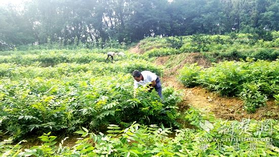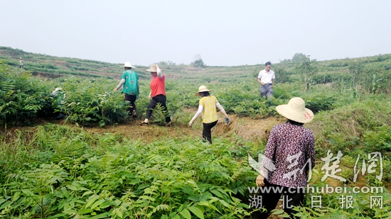 荊楚網(wǎng)(湖北日?qǐng)?bào)網(wǎng))訊(通訊員王婷)“香椿樹啊,喲唍喲,開著芽啊,哈嘿唑,我們振興有希望吔,啞哈嘿!”9月6日上午,黃石開發(fā)區(qū)·鐵山區(qū)大王鎮(zhèn),江垅百畝香椿基地里,傳出一聲聲當(dāng)?shù)亍皠濤埓钡拿袼赘枵{(diào)。伴隨著歌調(diào)聲,村支書陳迪富正帶領(lǐng)著脫貧戶,頂著“秋老虎”的余威,在香椿基地歡快地勞動(dòng)著。