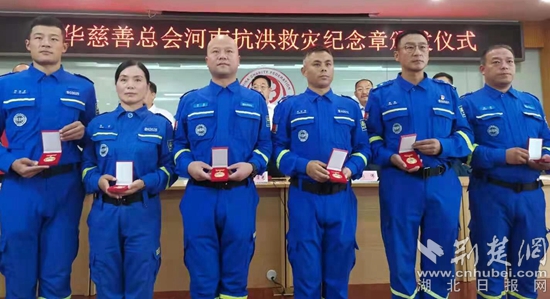 黃石藍天救援隊隊長董琳獲河南抗洪救災紀念章(右一)。通訊員供圖