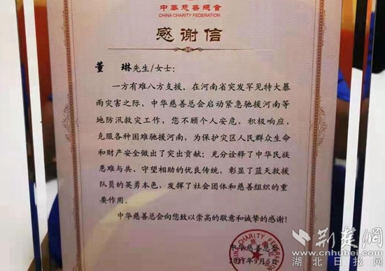 河南救災行動中,董琳作為黃石藍天救援隊隊長,充分展現(xiàn)了過硬的專業(yè)技能和無私的奉獻精神。在中華慈善總會河南抗洪救災紀念章頒發(fā)儀式上,中華慈善總會向董琳頒發(fā)個人紀念獎章。