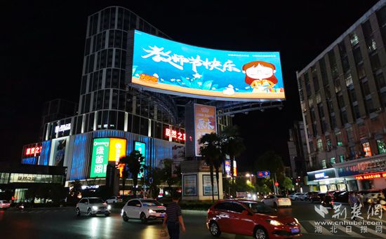 當(dāng)晚,在黃岡城區(qū)鑫湖大廈、萬(wàn)達(dá)廣場(chǎng)、黃州大道黃商購(gòu)物中心、勝利街奧康步行街、遺愛湖臨皋春曉、新荊楚大酒店、市人大政協(xié)辦公樓等室外屏幕及出租車車頂顯示屏上,以字幕滾動(dòng)等多種方式亮出“老師,您好”“教師節(jié)快樂(lè)”等口號(hào)、標(biāo)語(yǔ),向全市教師致敬。