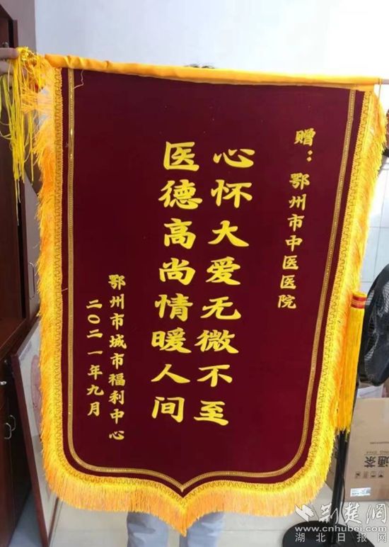 荊楚網(wǎng)(湖北日?qǐng)?bào)網(wǎng))訊(通訊員 嚴(yán)炎)9月18日上午,鄂州市城市福利中心為鄂州市中醫(yī)醫(yī)院送來了一面寫著“心懷大愛無微不至,醫(yī)德高尚情暖人間”的錦旗,向鄂州市中醫(yī)醫(yī)院駐守城市福利中心的醫(yī)務(wù)人員表示感謝。