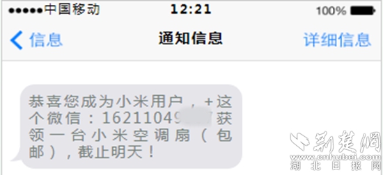 經(jīng)了解,一天前,張女士收到一條中獎(jiǎng)短信,提示其已成為小米用戶,可獲領(lǐng)一臺(tái)小米空調(diào)扇。
