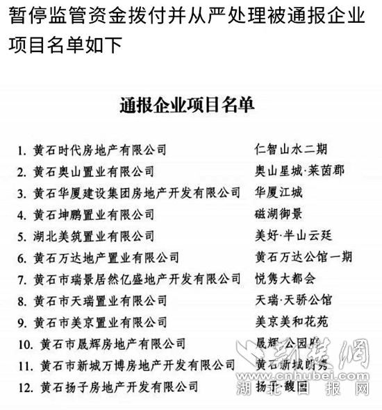 通告稱,12家被點(diǎn)名企業(yè)須及時(shí)整改,并將整改結(jié)果于9月30日前報(bào)黃石市住建局開發(fā)辦,整改不到位的,按照信用管理規(guī)定予以減分。