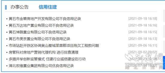 發(fā)布4條房地產(chǎn)公司不良信用記錄。來源:黃石市住建局官網(wǎng)