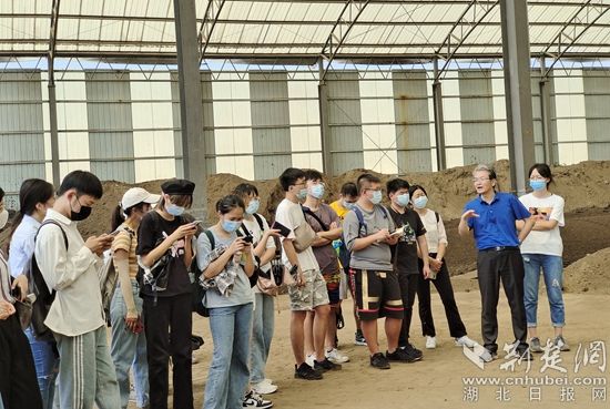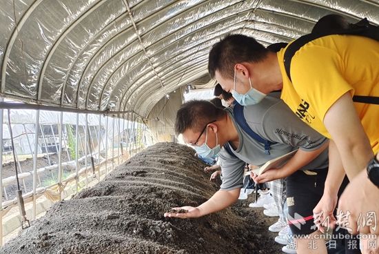 華農(nóng)師生在生態(tài)治理蚯蚓大棚現(xiàn)場交流蚯蚓養(yǎng)殖相關(guān)技術(shù)。通訊員供圖