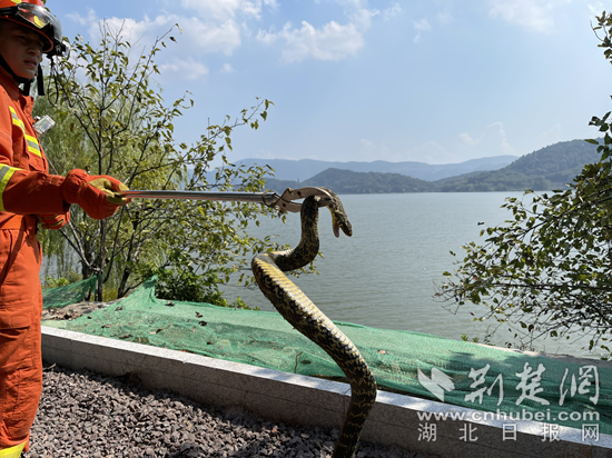 消防員迅速利用捕蛇工具將大蛇揪出。通訊員 供圖