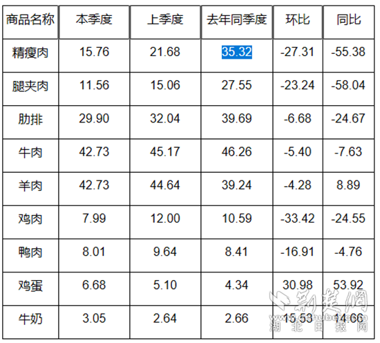 與淡水魚情況恰恰相反,本季度豬肉在連續(xù)二個季度持續(xù)下降的基礎上快速下降,精瘦肉價格環(huán)比下降27.3%,同比下降55.38%;雞蛋價格在本季度環(huán)比快速上漲31%,牛奶也步其后塵上漲15.5%。究其原因,在豬肉價格下行的帶動下,牛肉、羊肉、雞肉、鴨肉價格均有下降。雞蛋由于季節(jié)性缺貨,本季度上漲顯著。