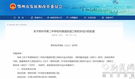 荊楚網(wǎng)(湖北日報網(wǎng))訊(記者 阮瓊)日前,鄂州市發(fā)改委對鄂州市第二中學校內(nèi)港道改道工程初步設(shè)計進行批復。該項目建設(shè)工期為6個月,概算投資1474.35萬元。