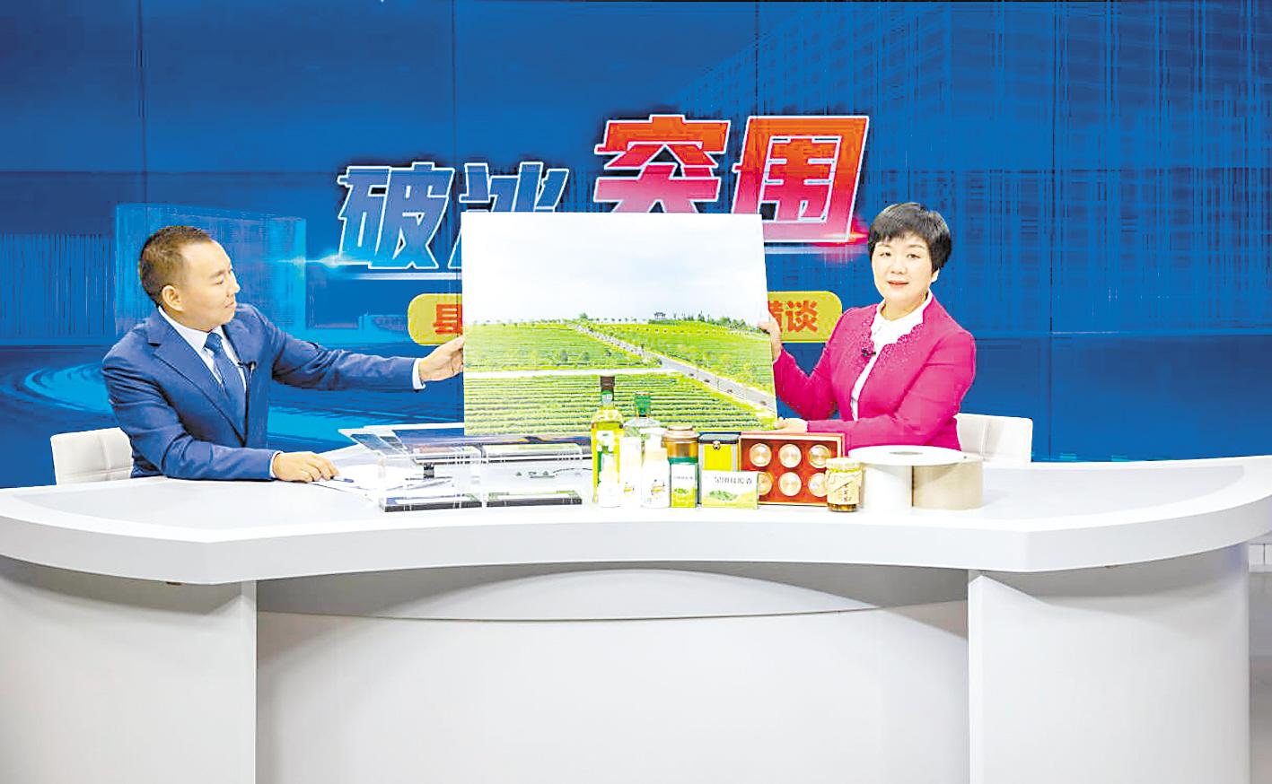 10月11日,通城縣委書記劉中英(右)做客湖北日?qǐng)?bào)5G演播室。 (湖北日?qǐng)?bào)全媒記者 柯皓 攝)