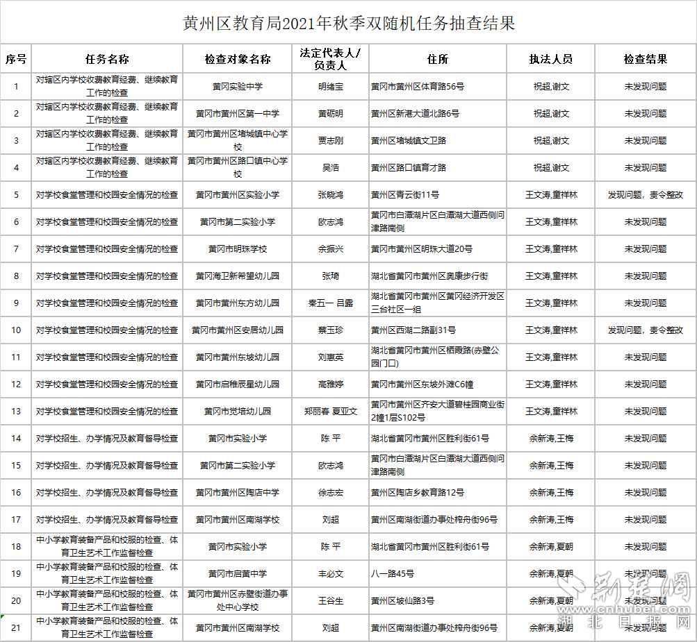 黃州區(qū)教育局2021年秋季學(xué)校雙隨機(jī)任務(wù)抽查結(jié)果。來源:黃州區(qū)教育局