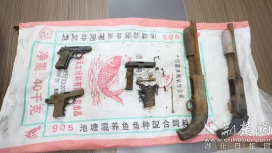10月18日,經(jīng)過持續(xù)追蹤,辦案民警在武漢某工地將謝某抓獲。經(jīng)深挖線索,警方隨后在謝某的華容區(qū)老家一處廢棄水井下約10米處查獲5把槍支,其中2把仿制式手槍,2把單管獵槍,還有1把手槍為零件拆散狀態(tài)。