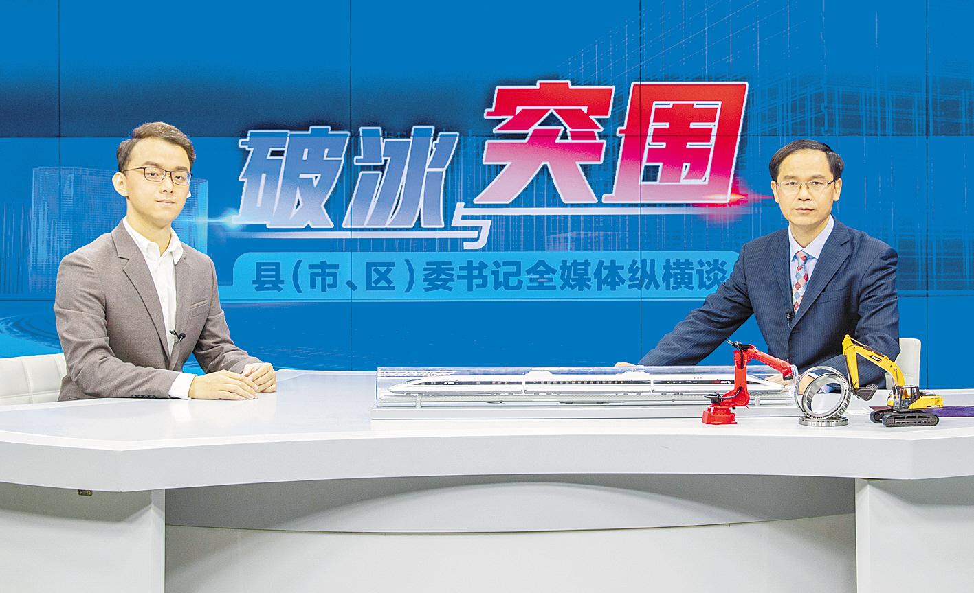 10月30日,黃石市下陸區(qū)委書(shū)記宛小林(右)做客湖北日?qǐng)?bào)5G演播室。(湖北日?qǐng)?bào)全媒記者 薛婷 攝)