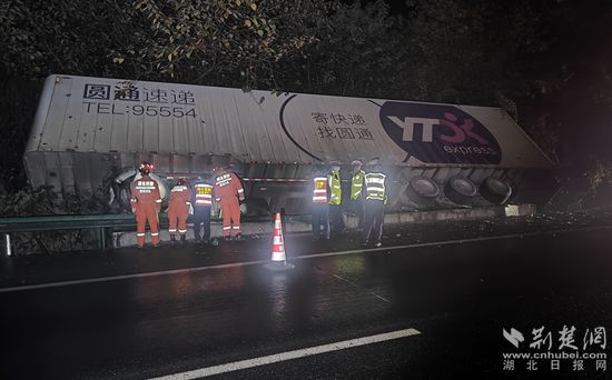 當(dāng)天凌晨3時53分,消防人員第一時間趕到現(xiàn)場經(jīng)偵查發(fā)現(xiàn):在高速路一處橋洞上方,一輛載貨2噸的圓通速遞箱式大貨車撞出護(hù)欄外,車廂半邊懸空兩頭側(cè)倒在山體上,恰巧車頭彎折懸空在一條三米多洞坑中,司機(jī)受傷被困在方向盤和座椅之間,疼痛難忍不停地喊疼。