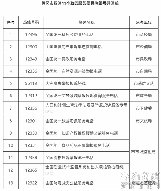 黃岡市取消13個(gè)政務(wù)服務(wù)便民熱線號(hào)碼清單。來(lái)源:黃岡政府網(wǎng)