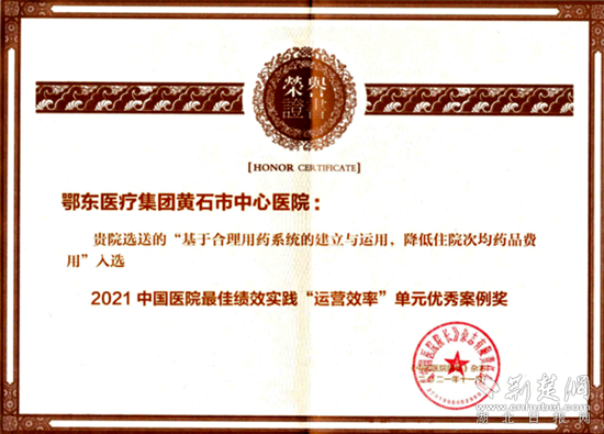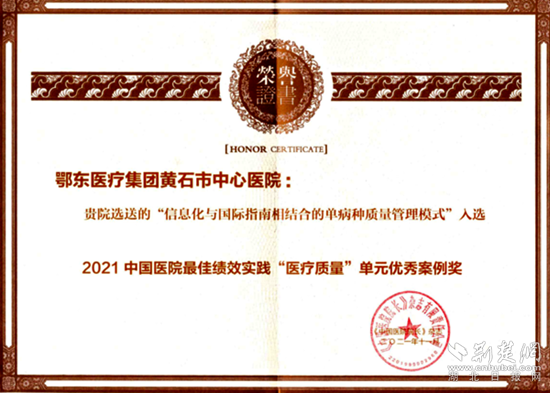 荊楚網(wǎng)(湖北日?qǐng)?bào)網(wǎng))訊(通訊員 石紅兵)近日,2021年第二屆全國績效大會(huì)標(biāo)桿管理案例評(píng)選結(jié)果揭曉,黃石市中心醫(yī)院參選的“信息化與國際指南相結(jié)合的單病種質(zhì)量管理模式”、“基于合理用藥系統(tǒng)的建立與運(yùn)用,降低住院次均藥品費(fèi)用”兩個(gè)案例,經(jīng)過嚴(yán)格遴選和評(píng)審,最終榮獲2021中國醫(yī)院最佳績效實(shí)踐“醫(yī)療質(zhì)量”優(yōu)秀獎(jiǎng)和“運(yùn)營效率”優(yōu)秀獎(jiǎng)。