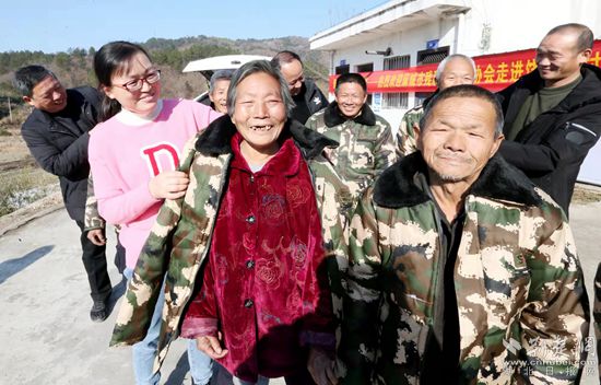 安置點五保戶黃全方老人穿上嶄新的迷彩棉大衣,高興地說:“你們真是雪中送炭,這衣服又暖和又好看,過年就穿這個了?!?/p>
