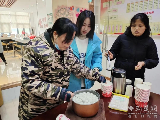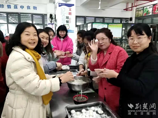 ▲尹家湖中學(xué)組織開展形式多樣的慶元宵活動(dòng)。中午,學(xué)校食堂內(nèi)一片歡聲笑語,各年級(jí)教師代表在食堂包湯圓,不一會(huì)兒,一個(gè)個(gè)圓滾滾的湯圓擺滿了桌面。