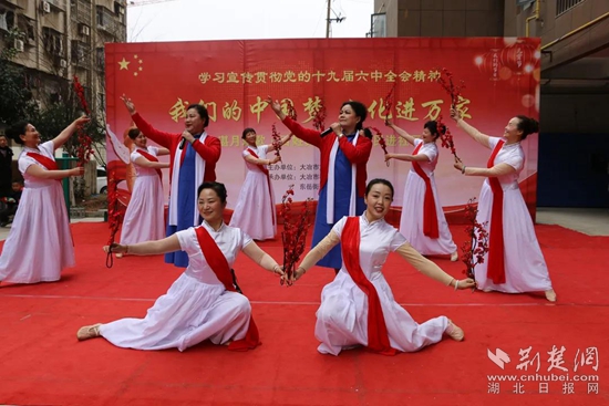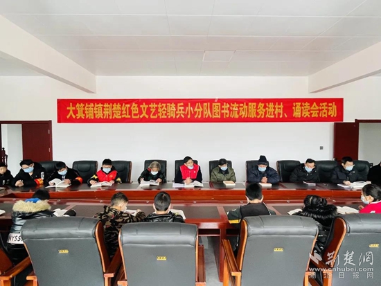 ▲大箕鋪鎮(zhèn)文化文藝志愿服務(wù)隊(duì)在曹家晚村開展“荊楚紅色文藝輕騎兵小分隊(duì)圖書流動(dòng)服務(wù)進(jìn)村、誦讀會(huì)”活動(dòng)。