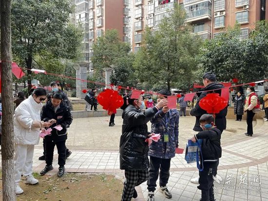 ▲觀山花園社區(qū)在紫金時(shí)代小區(qū)開展“濃濃鄰里情,歡樂鬧元宵”猜燈謎活動(dòng)。寫著謎語的紅紙條懸掛在喜氣的燈籠上隨風(fēng)飄舞,謎面涵蓋了黨史知識(shí)、生活小常識(shí)和冬奧會(huì)知識(shí)。