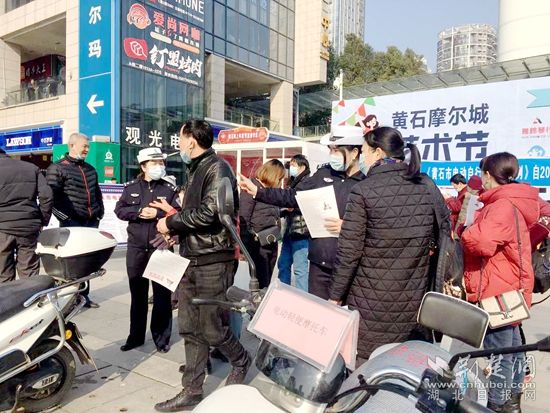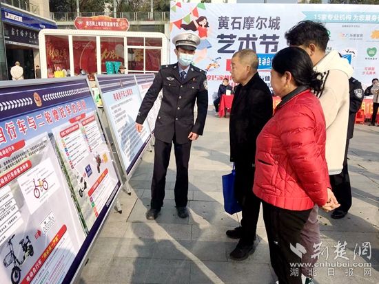 當(dāng)天上午,交巡警黃石港大隊(duì)、黃石港區(qū)城管局、黃石港區(qū)市場(chǎng)監(jiān)督管理局等多部門集中“擺攤”,現(xiàn)場(chǎng)解答群眾法規(guī)、上牌、停放、保險(xiǎn)等方面疑問(wèn)。